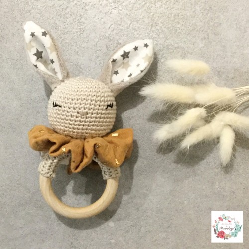 Hochet trop mignon avec sa collerette et ses oreilles en tissu. Il est idéal pour les touts petits comme pour les plus grands avec ses  différentes textures ainsi que le son du grelot qui favorise l’éveil de bébé!