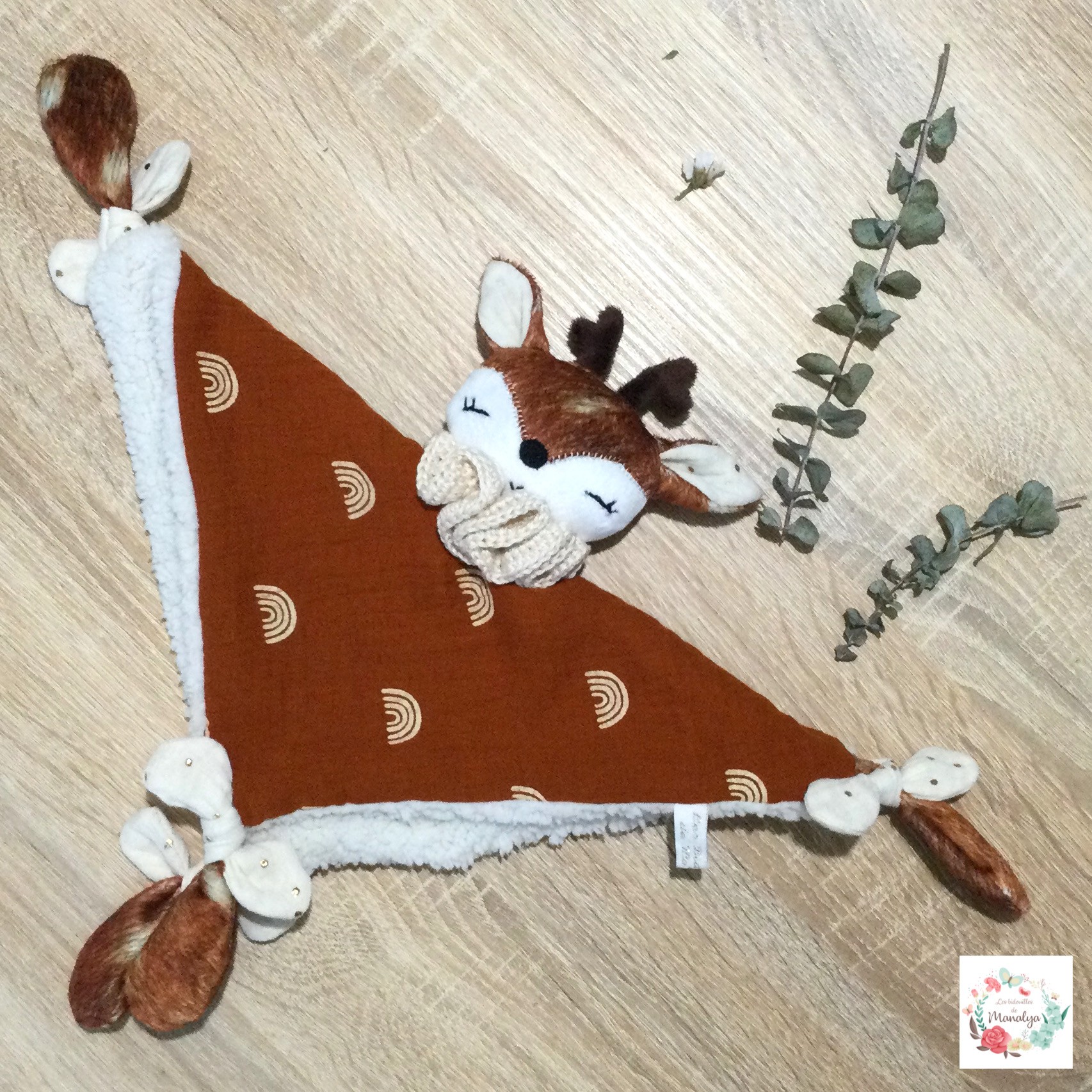 Le doudou solidoux est un doudou ultradoux composé d'un carré de 24 cm de côté avec en son centre une tête d'animal. Des papilles avec noeuds sont cousues aux quatres coins afin d'éveiller les sens de bébé et une collerette au crochet ajoute de l'originalité et un mixte de matières.